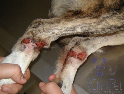 Lesões ulceradas e profundas em mestiço Pastor Alemão